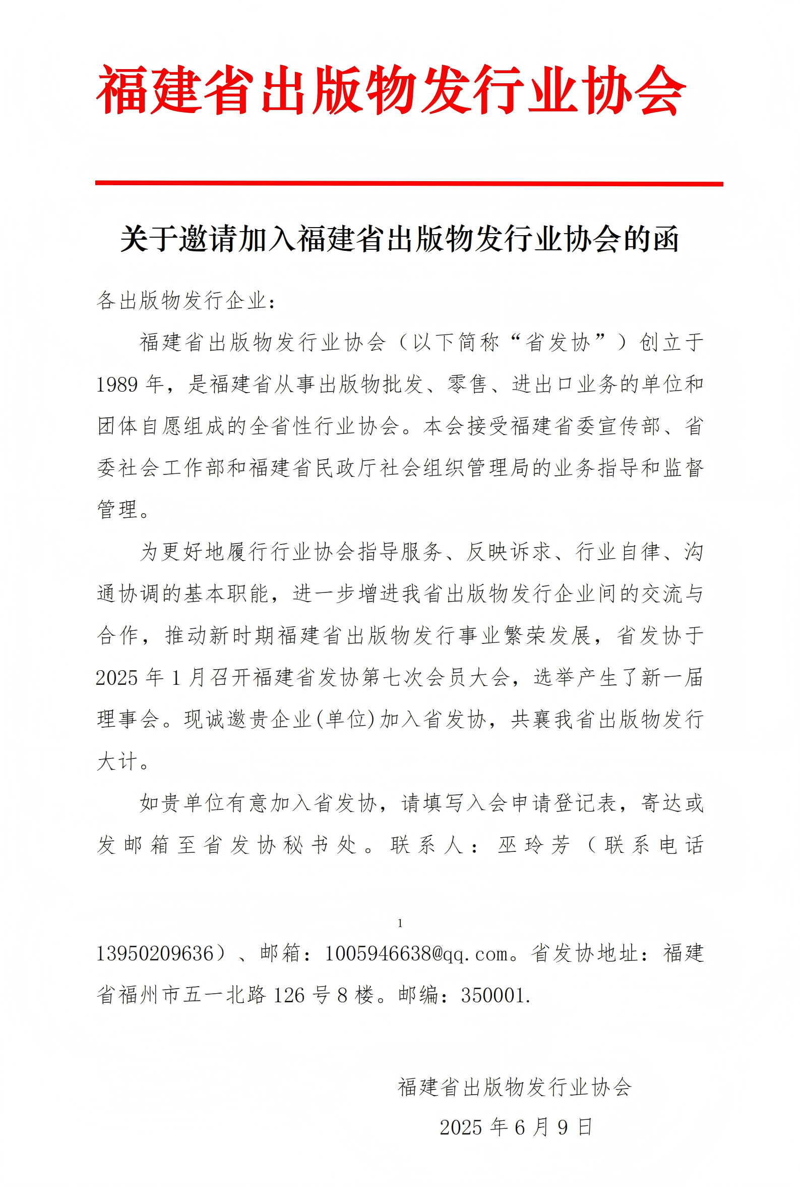 关于邀请加入福建省出版物发行业协会的函