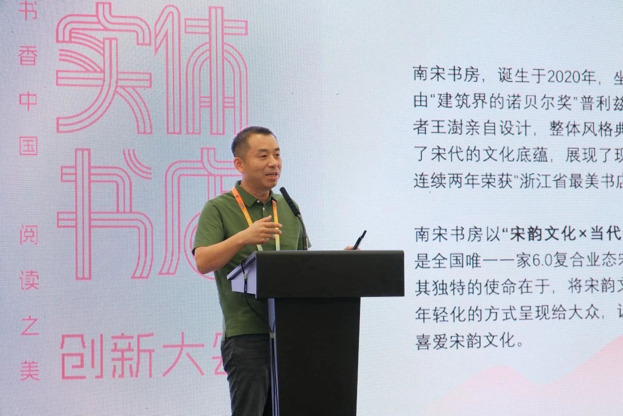 2020年开业、坐落于西子湖畔的南宋书房,由普利兹克建筑奖获得者王澍亲自设计,连续两年荣获“浙江省最美书店”称号。南宋书房以“宋韵文化×当代审美”为核心,是全国唯一一家6.0复合业态宋韵主题书店。南宋书房主理人赵群伟在大会分享中指出,书房独特的使命在于,将宋韵文化的精髓,以年轻化的方式呈现给大众,让更多人了解和喜爱宋韵文化。南宋书房的6.0复合业态也紧紧围绕这个使命展开:宋韵文化图书的集中展示,品类涵盖历史 、文化、教育 、建筑、 医药等,包括大量宋韵⽂化普及类读本及古籍影印本2万余种。宋韵主题文化活动的开展,以宋韵艺术、考古等主题作为讲座及活动的主要⽅向,传播宋韵⽂化。宋韵主题文创的研发,深度挖掘宋韵⽂化,融合现代审美,成为弘扬传统⽂化的国潮⽂创引领者。宋韵文化主题出版,策划出版宋韵⽂化相关图书,把宋韵文化科普化普及化。宋韵主题邮局,拥有独立的邮路、邮戳、邮筒等,让读者感受宋韵⽂化与邮政⽂化的融合。宋韵新形态传播,利用新媒体等手段,做好宋韵⽂化的传播,讲好宋韵故事,扩⼤宋韵⽂化的影响力。赵群伟表示,未来南宋书房还将扩充宋韵藏书体系、加强原创内容策划,拓展演出形式与主题、举办系列主题活动,打造多功能演出区域、设置互动体验专区、优化智慧服务设施,创新产品设计、拓展销售渠道,设立产学研一体化平台、开展文化交流互访。