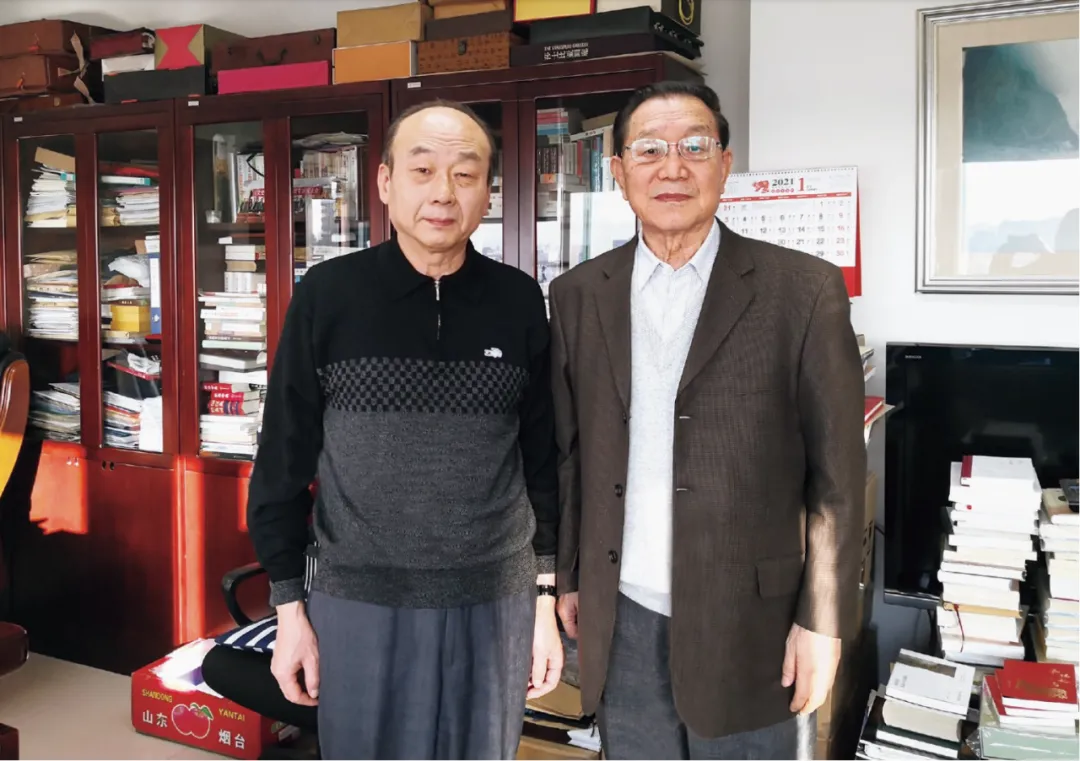 2021年1月,与中国书刊发行业协会第二任会长,原新闻出版总署副署长,中国出版集团首任总裁杨牧之同志(右一)