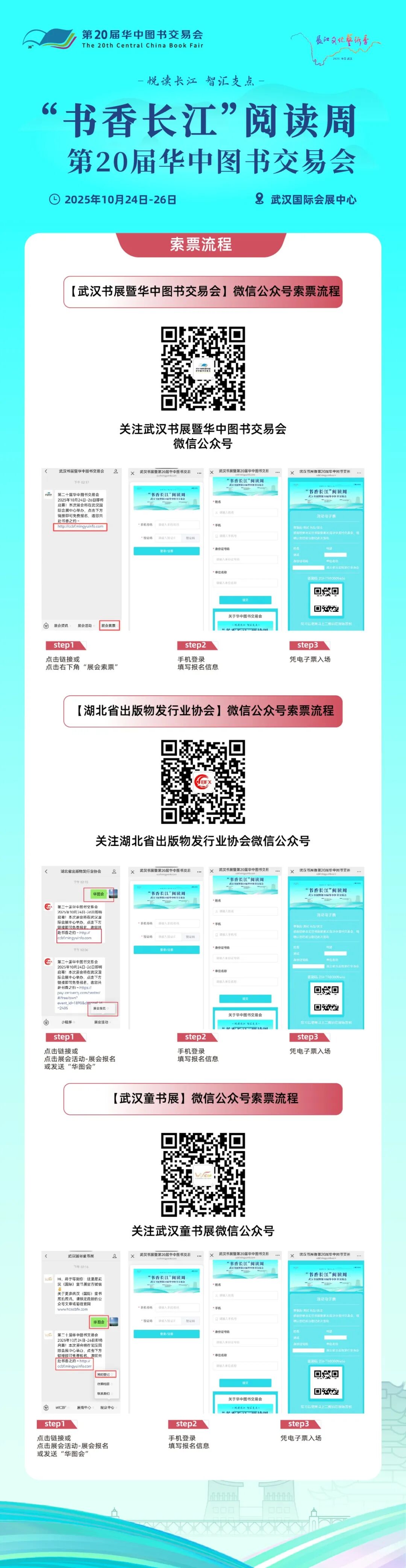 “悦读长江 智汇支点”,“书香长江” 阅读周暨第 20 届华中图书交易会即将于 2025 年 10 月 24 日 - 26 日在武汉国际会展中心举办。想要去现场感受图书盛会的小伙伴,这份索票流程请收好~