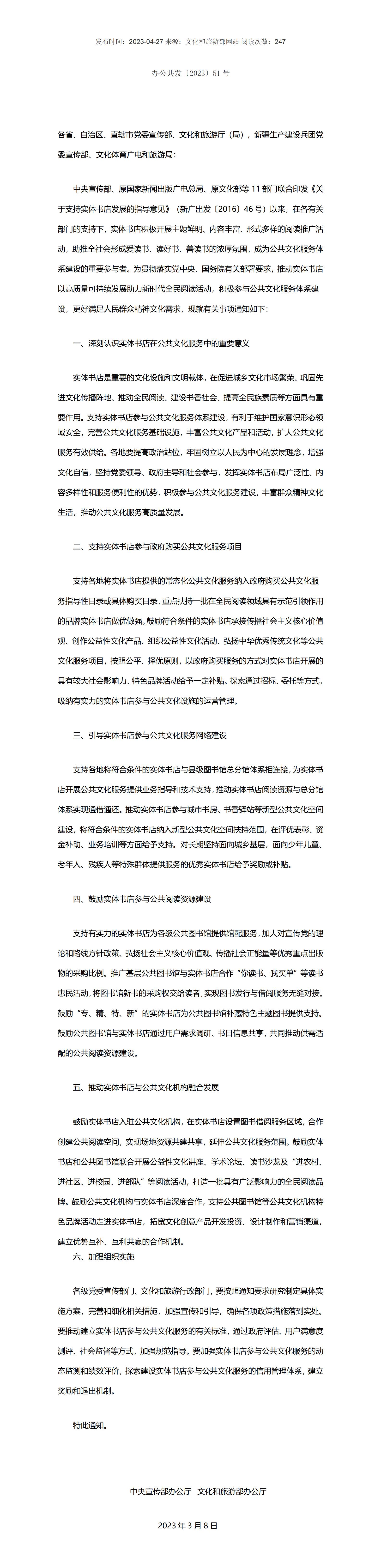 中央宣传部办公厅 文化和旅游部办公厅 关于推动实体书店参与公共文化服务的通知